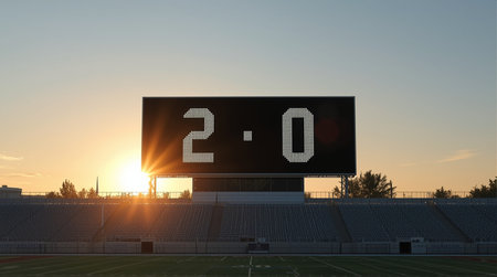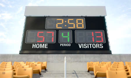 A stadium scoreboard screen above the stands in the day time showing the home side winning - 3D render