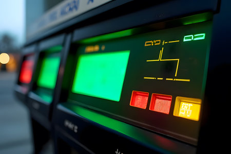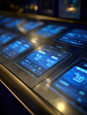 Digital control panel features illuminated screens showing data and measurements in a contemporary setting during nighttime.