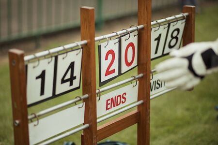 A close up shot of a lawn bowling scoreboard on grass, showing double digits.