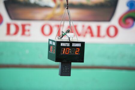 Close-up of a central stopwatch for cockfighting with Otavalo letters in the background, Ecuador 2015.