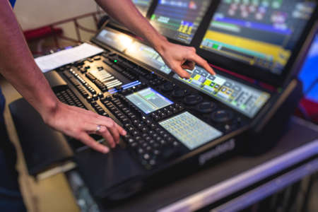 View of lighting technician operator working on mixing console workplace during live event concert on stage show broadcast, light mixer controller panel, sound technician with a professional equipment