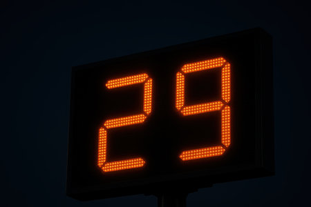 Bright electronic scoreboard with glowing orange digits displaying number 29 on black background in dark environment.