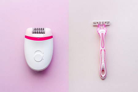 Modern epilator and razor on color background, top view.