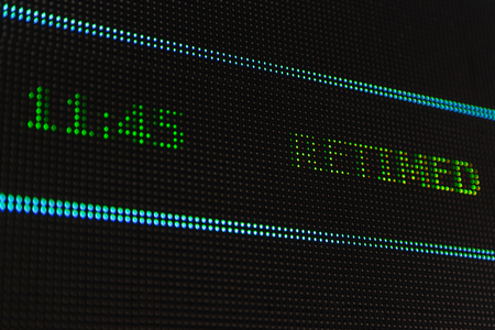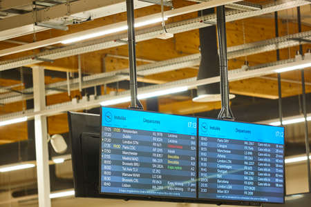 Airport boarding gates information displays. Flight schedule. Departure arrival screen