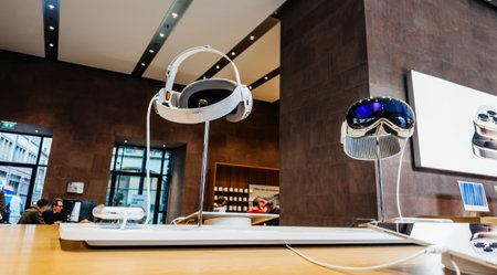 Paris, France - Dec 10, 2024: Apple Vision Pro and its accessories showcased on a sleek table in an Apple Store, highlighting cutting-edge design and augmented reality innovation.
