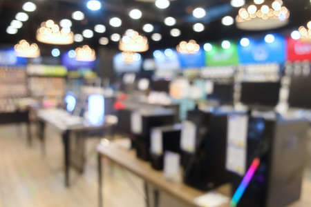 Blurred image background of interior shop store with computer laptop and accessory device products for sale to customer