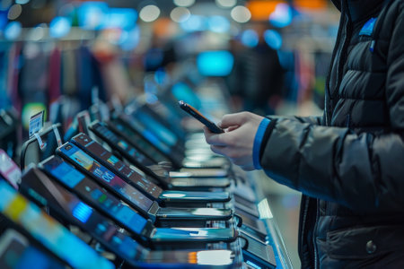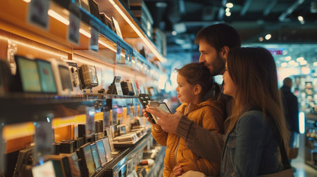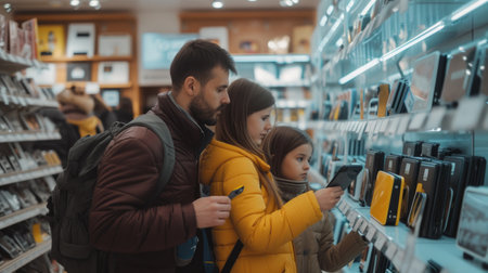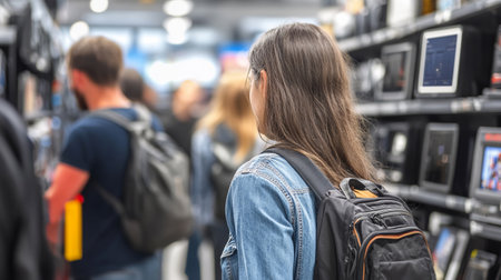 A diverse group of people browse electronics in a busy store. The scene captures shoppers interacting with various gadgets, showcasing modern retail energy.