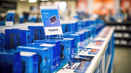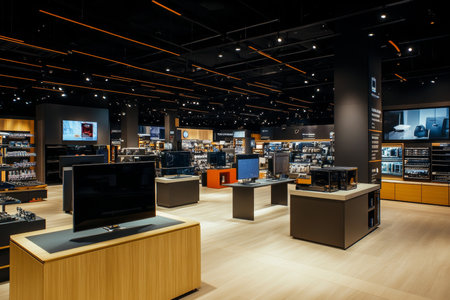 High-tech retail scene: shoppers explore gadgets during calm Black Friday start. Digital banners, sleek interior. Ideal for tech brands, e-commerce, or holiday ads.