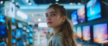 A young woman discusses sleek flatscreen TV options with a sales rep in an electronics store. Concept Electronics Shopping, Flatscreen TVs, Sales Assistance, Consumer Choices, Retail Experience