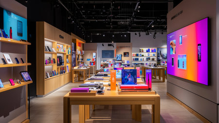 The vibrant interior features elegantly arranged displays of mobile phones and gadgets. Bright colors illuminate the space, creating an inviting atmosphere for shoppers interested in technology.