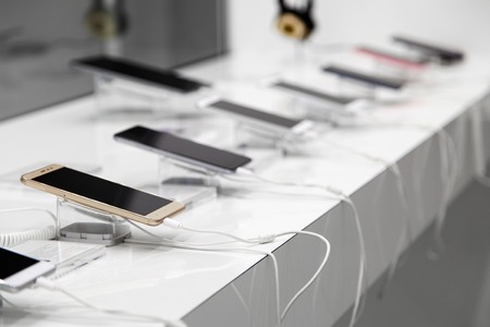 Showcase with smartphones in the modern electronics store. Buy a mobile phone. Many smartphones on the shelf of the technology store