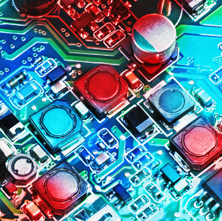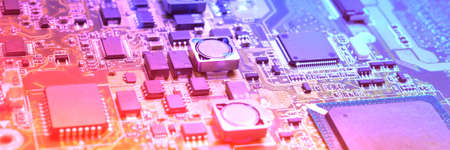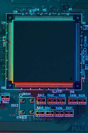 Closeup of electronic hardware. assembly on the circuit board with dark red and blue reflection, conceptual creative association