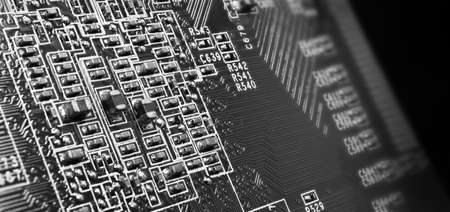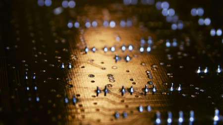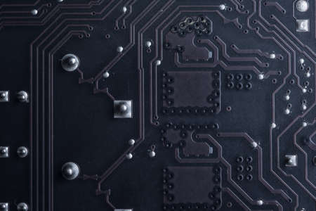 Creative concept of modern technology, inside an electronic device. Electronic circuit board close up in low key. Selective focus