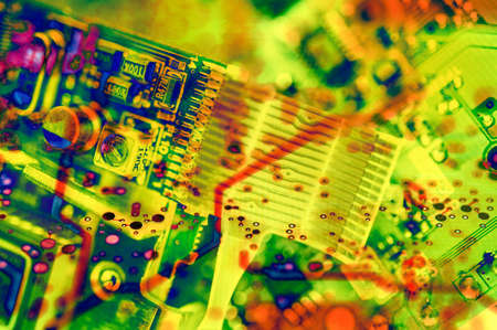 Closeup on electronic board in hardware repair shop, blurred and toned image. Shallow DOF, focus on the middle left field