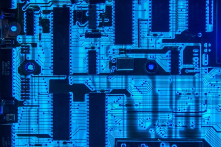 Board with electronic microcircuits macro photography under blue light, macro technology