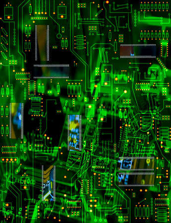 Abstract electronic circuit board. Background on electronic subjects. Circuit board with green neon lighting. PCB background. Texture technological style. Abstract background without focus. 3d image.