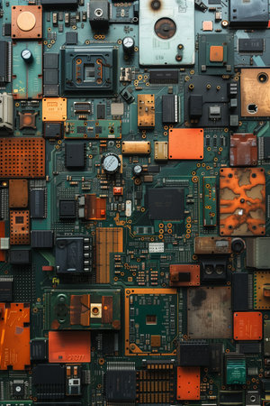 An abstract representation of microchips and electronic components arranged in an intricate pattern. This high-resolution image highlights various shapes and textures that emphasize innovation and technology. Perfect for tech-related themes.
