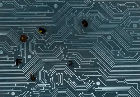Miniature figurines posed as business people in a meeting over abstract futuristic circuit board, future business concept