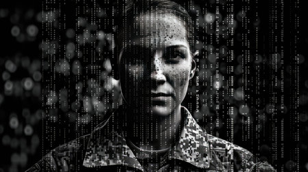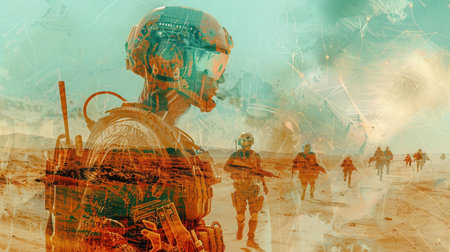 A soldier wearing camouflage and tactical equipment is silhouetted against a vibrant digital backdrop displaying data.