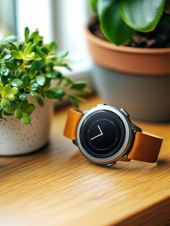 Modern smartwatch with brown leather strap displayed on a wooden table, showcasing technology and style with nearby houseplants