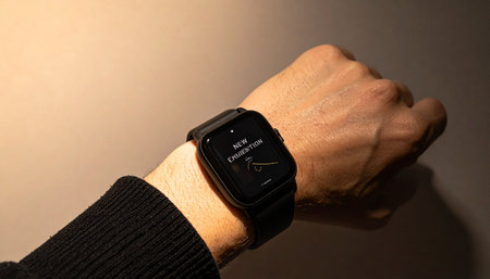 A close-up, personal perspective of a person glancing at their smartwatch.