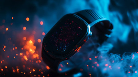 Smartwatch features a stunning cosmic display, enveloped in colorful smoke and glowing sparks, emphasizing cutting-edge technology and artistic design elements, AI generated