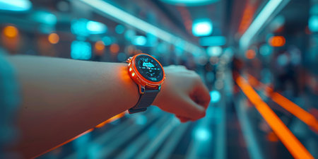 Futuristic smartwatch glowing in a high-tech urban environment with a neon lights.