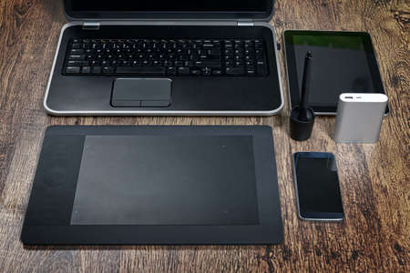 Top view of office desk with laptop computer, mobile phone, graphic tablet with pen and power bank