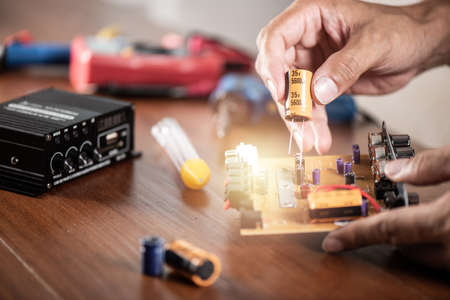 Technician repairing the electronic device. Reparing the audio amplifier. Close up at the orange capacitor.