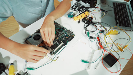 Closeup of boy hand fixing motherboard with electronic tool on table. Top view of highschool student repair electric board with electronic equipment, wires tool scatter around on table. Edification.
