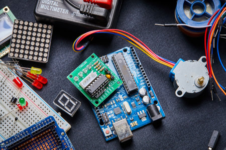 Engineer workplace. Top view of disassembled microcontroller, electronic components and wires.