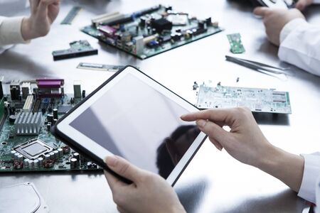 Technician with computer circuit board with chips. Spare parts and components for computer equipment. Production of electronics and maintenance.