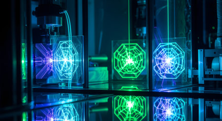 A vibrant display of laser technology in a modern lab. The intricate machinery showcases colorful illumination, emphasizing precision and innovation in scientific research.