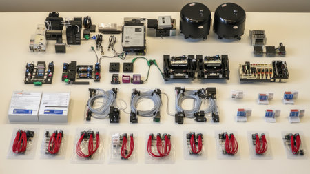 A comprehensive layout of various electronic components and accessories ideal for automation projects, showcasing cables, connectors, sensors, and more for easy identification.