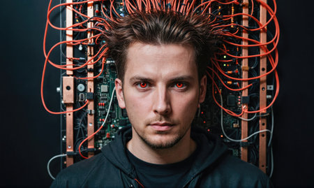 A man with red eyes stares intensely at the camera, surrounded by wires and circuitry