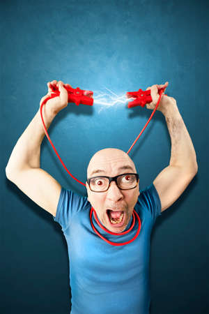 young untrained man joining electrical cable suffering domestic accident with dirty burnt face in funny shock expression screaming crazy in electricity DIY repairs danger concept