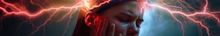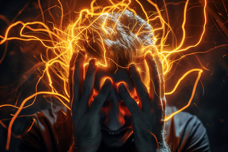 A man with a severe headache holds his head in his hands, his face contorted in pain, and blurry, distorted light streaks through the image, creating a sense of disorientation and anxiety.