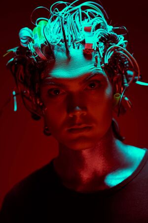 Portrait of a cyborg man in red light. Biological human robot with wires implanted in the head. Technologies of the future.