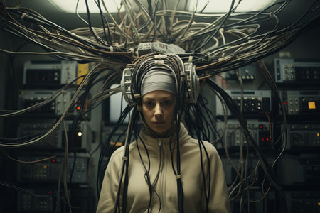 Technologys wired embrace. person enveloped by cables signifying information flow