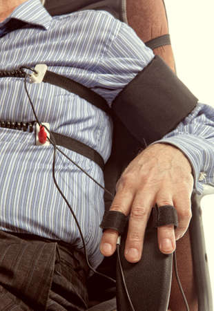 womans hand in a lie detector apparatus close-up
