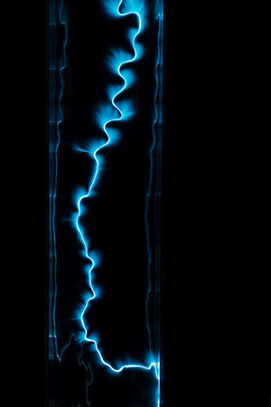 Blue electric discharge on a black background. Glowing lightning in a plasma lamp. Electrical energy flash