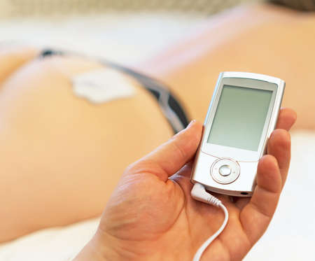 Close up electrostimulator on man stomach. Myostimulation therapy