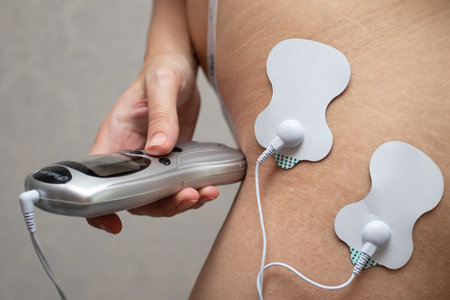 Small electro stimulator and electrodes placed on a woman’s back – Electric medical device used in alternative therapies – Concept image for pain relief and relaxing massage