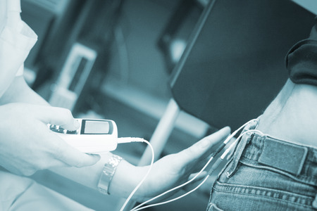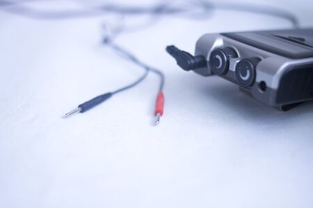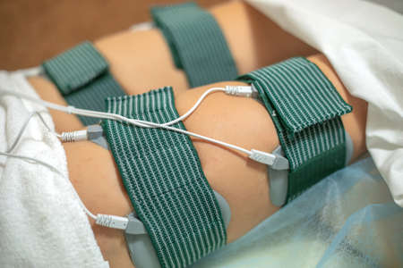Electro physiotherapy electrical impulse stimulation rehabiliation treatment from injury equipment in hospital clinic for electrical stimulus attached with plaster.