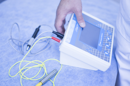 Electrode stimulation electro physiotherapy electrodes in medical center in hands of physiotherapist.