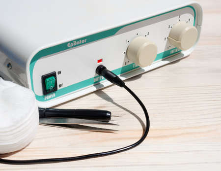 Electric epilator for hair removal, needles and tweezers. A device for removing hair from people on a white table.