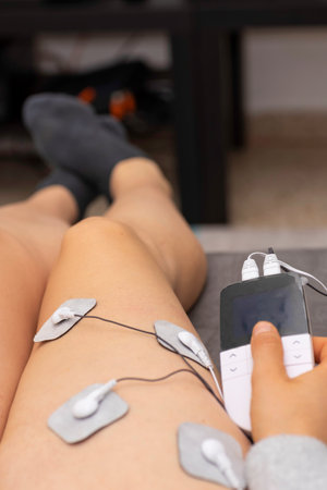 Woman using small electro stimulation device on her thigh