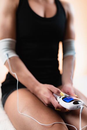 Close-up of a personal trainer touching with one hand the electric machine with the electrostimulator electrodes in the arm of a female deportist, upside down on a bed