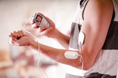 Patient applying electrical stimulation therapy on arm. Electrical tens. Pain Relief Stiffness Muscle Massage