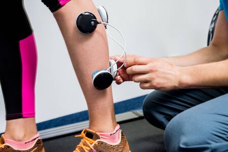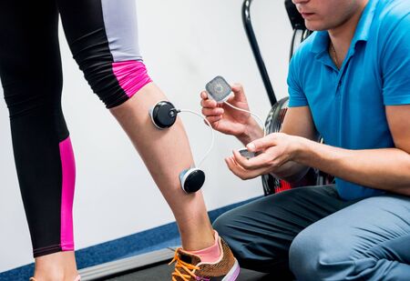 Physical therapist install electrostimulator on the muscles of the legs. Fitness training with an electrostimulator. Physiotherapy.